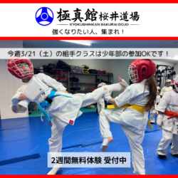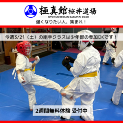 強く、やさしく、たくましく。🥋✨ 極真館桜井道場は、 明るく・真面目に・楽しく空手に取り組める道場を目指しています。 本日は幼年クラスにて、 年長の女の子が体験に来てくれました😊✨ 回数を重ねていることもあり、 落ち着いてしっかり稽古に取り...