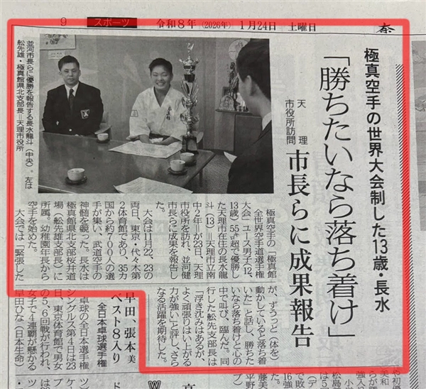 2025年に開催された「世界空手道選手権大会」に出場し「12~13歳男子55㎏超級」の部で見事優勝し、天理市のSNSや奈良新聞でも取り上げられました。